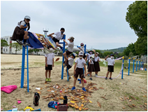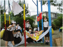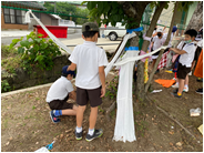 布をつなぐといっても、布同士の結び方を考えて強度をあげてみたり、止め方によってはテープを使った方がよかったりなど、班で協力して工夫する姿がたくさんありました。