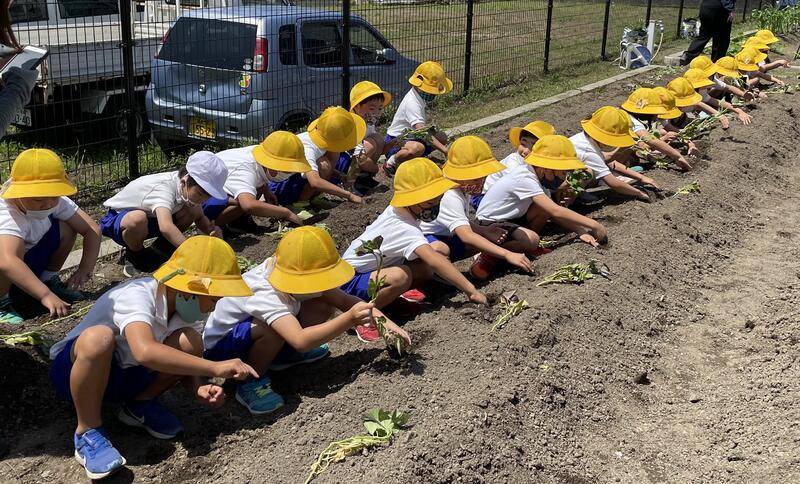 今日、1年生の畑にさつまいもの苗を植えました。