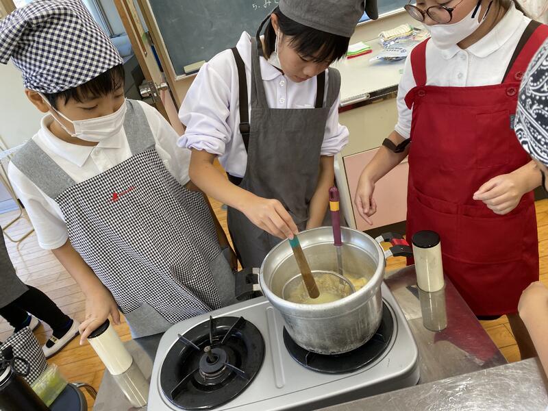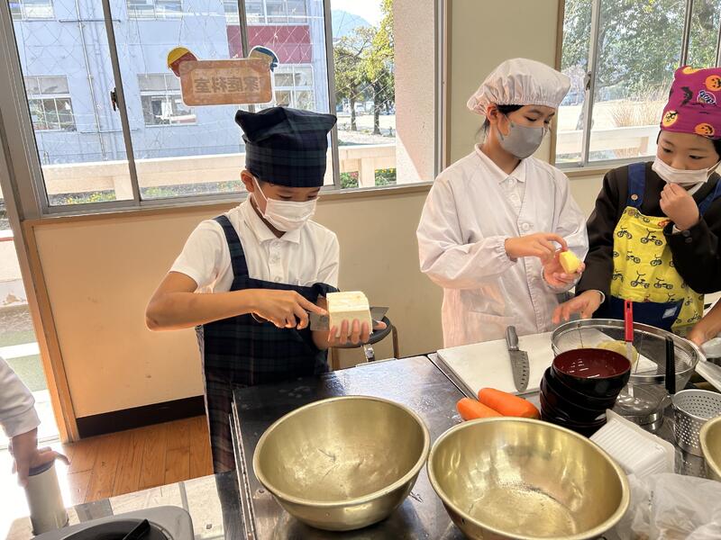 家庭科の調理実習で、みそ汁を作りました。自分たちで選んだ食材を使って、上手に作っていました!