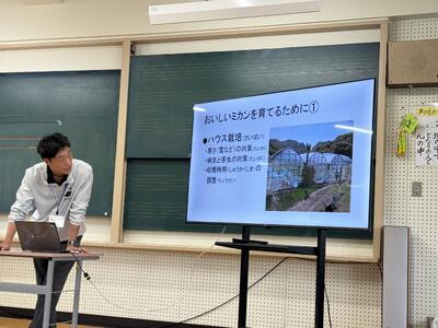 10月29日に天草市役所農業振興課の柴田様、高橋様、11月5日に水産振興課の糸田様をお招きし、天草の農業や水産業についてお話を伺いました。天草の農業については、様々な種類のみかんの栽培がさかんなことや、ドローンなどのロボットの活用が進んでいることなどを学びました。また、水産業については、季節ごとの旬の魚や、養殖や定置網漁などの様々な漁法について学びました。特に子どもたちは、農作物や魚などの「値段」に興味をもっていたようです。天草の自然とそれを支える方々の努力に触れ、子どもたちにとって貴重な学びの機会となりました。