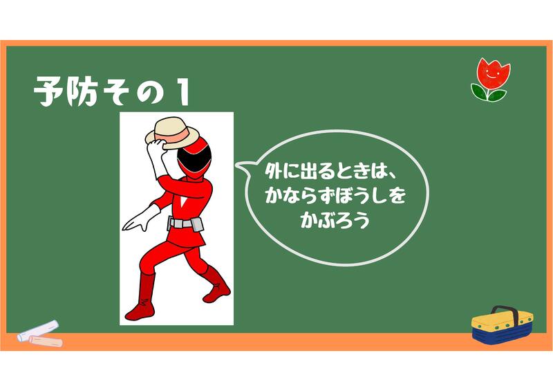 外に出る時は、必ず帽子をかぶる。ご家庭では、学校に登校するときに帽子をかぶっていくように声掛けをお願いします。