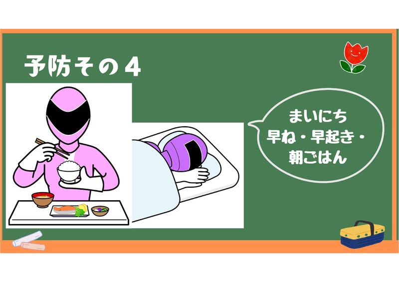 適度な運動を心がけ、バランスの取れた食事をとり、十分な睡眠をとる。早寝・早起き・朝ご飯をご家庭で子どもたちに声掛けをお願いします。