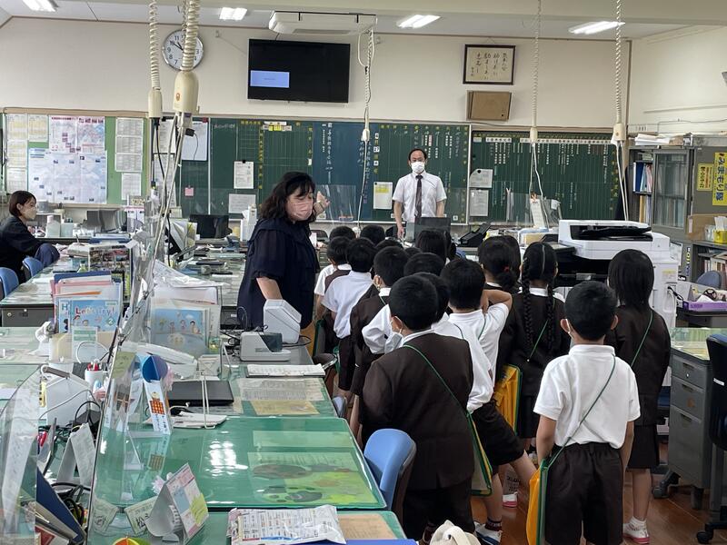 その後、職員室も見学していました。先生たちがお仕事する部屋というこごで、机がたくさんあることに驚いていたようでした。