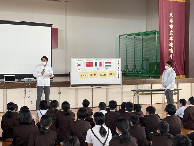 この日、小学生向けに租税の仕組みや重要性を税の専門家である税務署や税理士の方、天草法人会の皆様にわかりやすく説明していただきました。