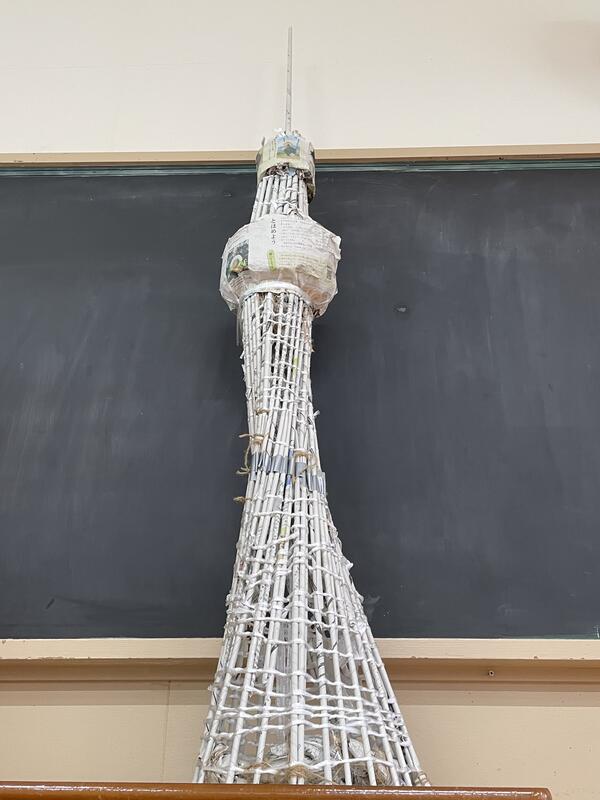 新聞紙を丸めて棒状にしたものを何本も束ね、紐で編み込みながら、2メートル近くもあるタワーを作っていました。学童クラブのお友達に手伝ってもらい、見事な「スカイツリー」の出来上がりです。