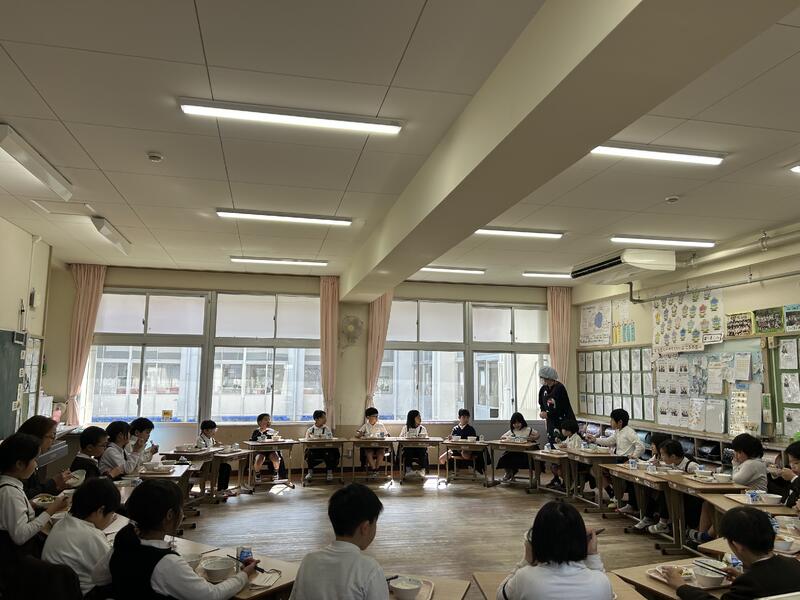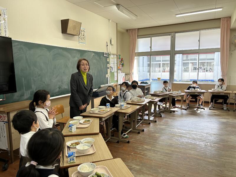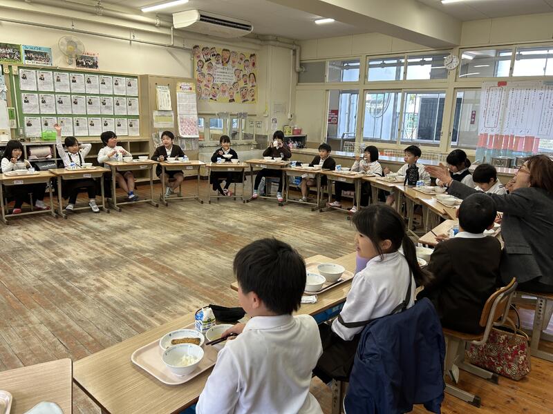 1月29にち、2年1組で学校給食週間に合わせた「ふれあい給食」が行われました。天草教育委員会から木下えり子教育委員さんがいらっしゃり、子ども達と楽しく会食されました。この日は「天草宝島デー」の日で、具だくさんの豚汁と、天草産のブリのフライでした。子どもたちは、木下委員さんとおいしそうに給食を食べていました。木下委員さんは、「天草の人口は何人でしょう。」「天草に小学校はいくつあるでしょう。」「給食が始まったのはいつからでしょう。」など、天草に関するクイズを出してくださり、子どもたちは様々に答え、とても盛り上がっていました。とても楽しい時間となりました。