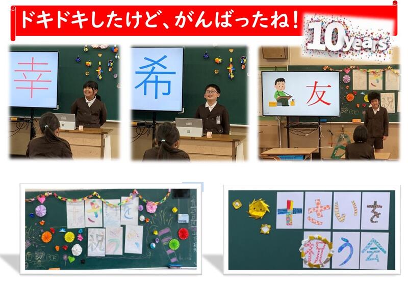 十歳を祝う会(4年) 投稿日時 : 2023/02/25 学校サイト管理者 4年生は、2月24日(金)に十歳を祝う会を行いました。スピーチでは、緊張しながらも、参加者全員が将来の夢や家族への思いを語ることができました。笑いあり涙ありの心温まる会となりました。
