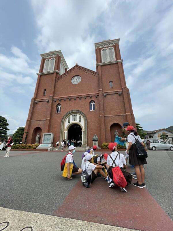 買い物の後は、班別自主行動です。班別自主行動では、気持ちを切り替えて、平和公園・山里小学校・原爆落下中心地・如己堂・浦上天主堂をさるくガイドさんと一緒に回り、戦争の恐ろしさ、平和の尊さを学びます。