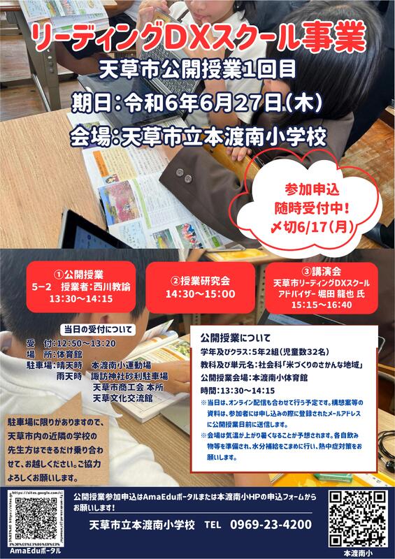 ※駐車場に限りがありますので、参加される天草市内の近隣の学校の先生方はできるだけ乗り合わせて、お越しください。ご協力よろしくお願いします。