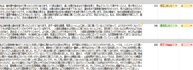 ↓↓スプレッドシート内の子どもの記述例↓↓