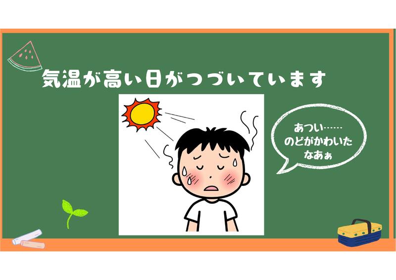 子どもたちが熱中症にならないように、学校・家庭で連携・協力して予防に努めていきたいと考えています。以下の点につきまして、ご協力よろしくお願いします。