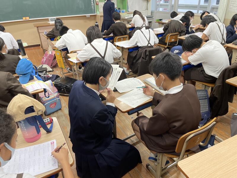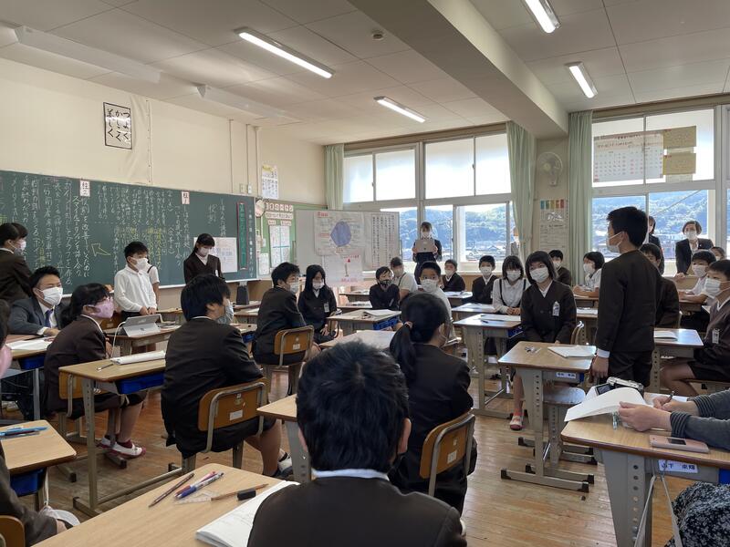 またこの日は、本渡中学校から音楽の先生の福嶌先生に来ていただき、全クラスの合唱を聴いていただきました。最後に、講評の中でたくさん褒めていただきました。各学級とも、とても自信になりました。福嶌先生、本当にありがとうございました。