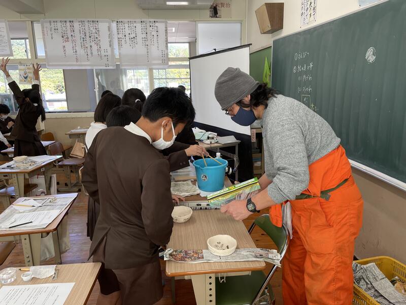 1学期に引き続き、6年生が作陶体験に挑戦しました。先生は、昨年同様「水の平焼き」の岡部さんでした。今回の体験は、絵付け作業です。