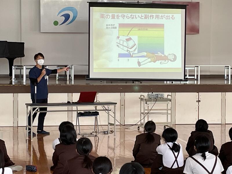 講師は、本校の学校薬剤師の川口拓也先生です。本校の保護者でもあります。プレゼンを使いながら、丁寧にわかりやすくお話いただきました。