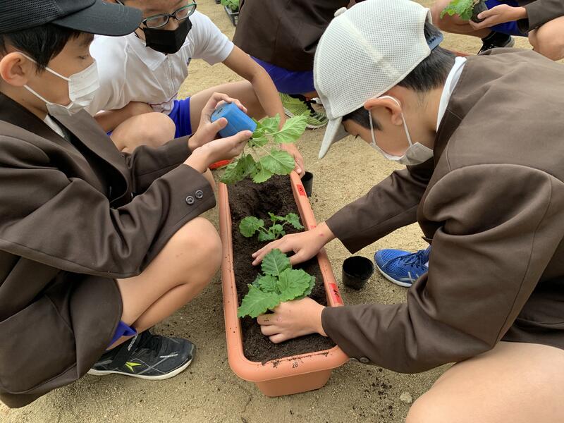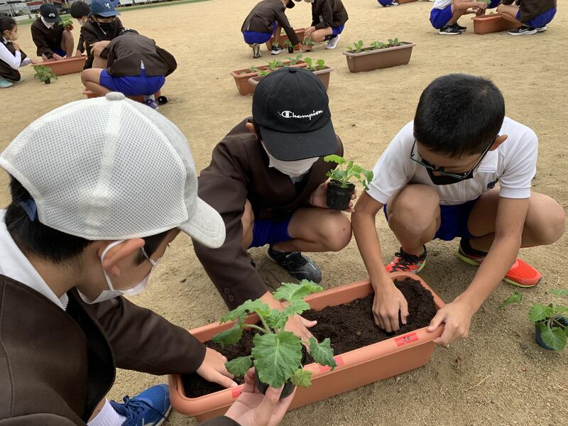6年生全員が一人一苗でプランターに移植し、その後も、水やりや液肥をやりながら卒業式まで大事に育てていきます。この日は、慣れない手つきで戸惑いながらの作業でしたが、みんな真剣に取り組んでいました。