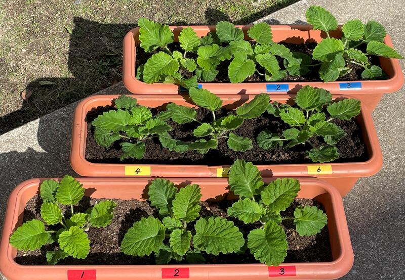 実は、このサクラソウの種は、前年度の6年生(現中学1年生)が育てたサクラソウからとった種です。この種を7月頃から育苗用培土に植え付け、4ヶ月かけて育苗ポットで苗まで育てます。そして秋になってから、その苗をプランターに植え替え、育てていきます。この取組は、2年前(現中学2年生が6年生の時)から行っています。