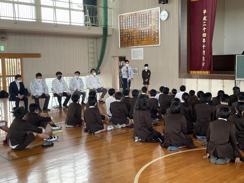 本日、朝から天草工業高校から34名の生徒さんが来校し、全校児童に読み聞かせをしていただきました。