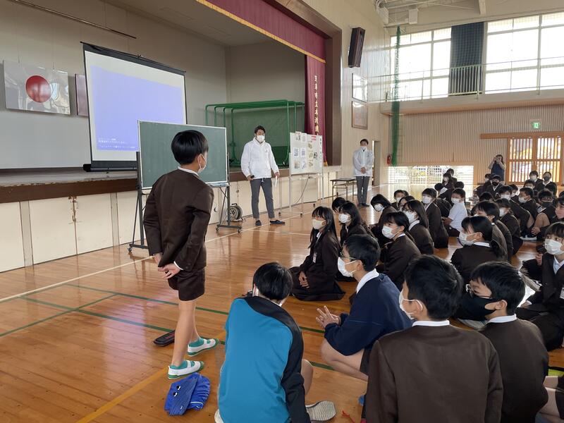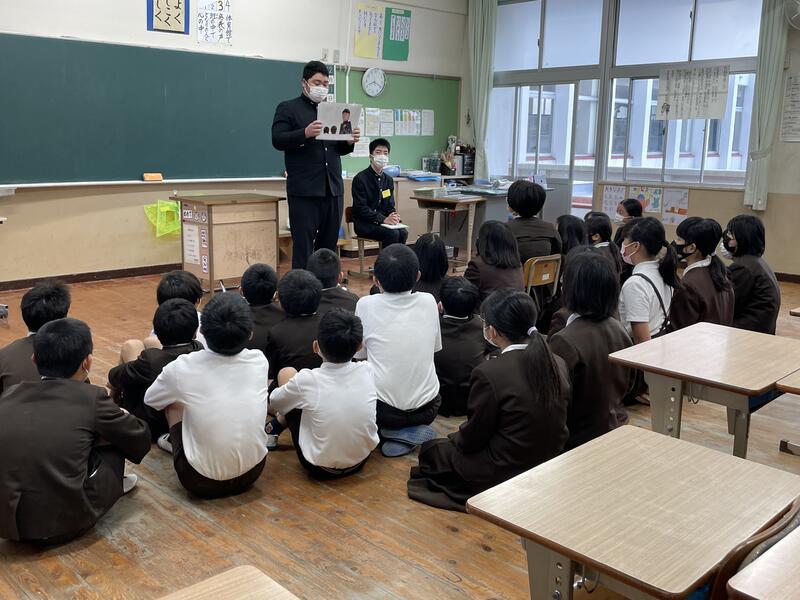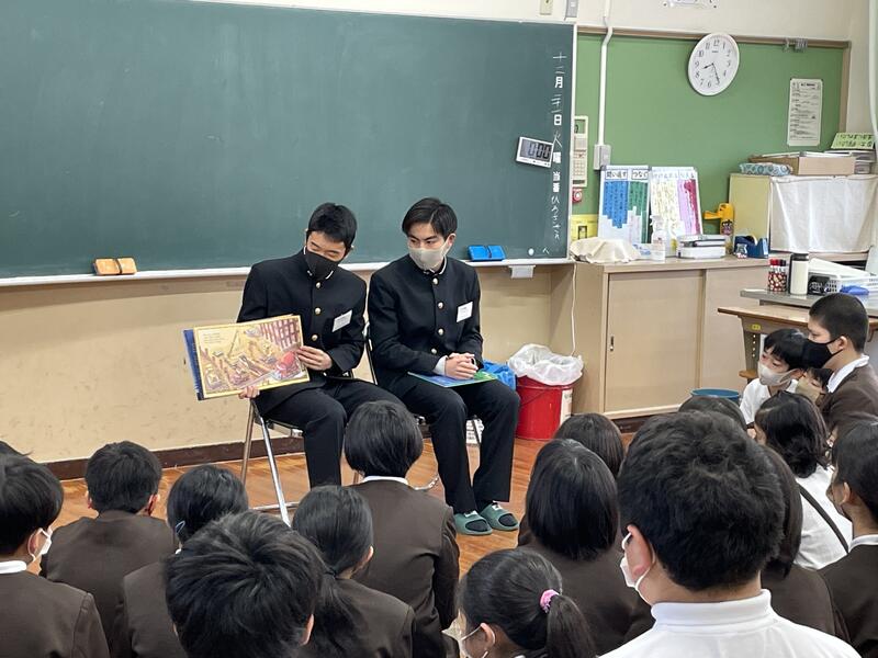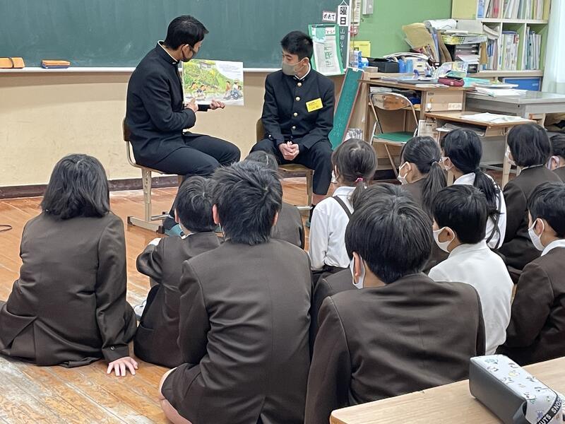 本日、朝から天草工業高校から34名の生徒さんが来校し、全校児童に読み聞かせをしていただきました。