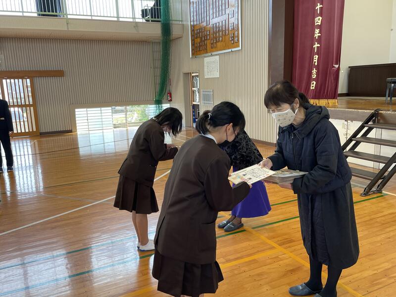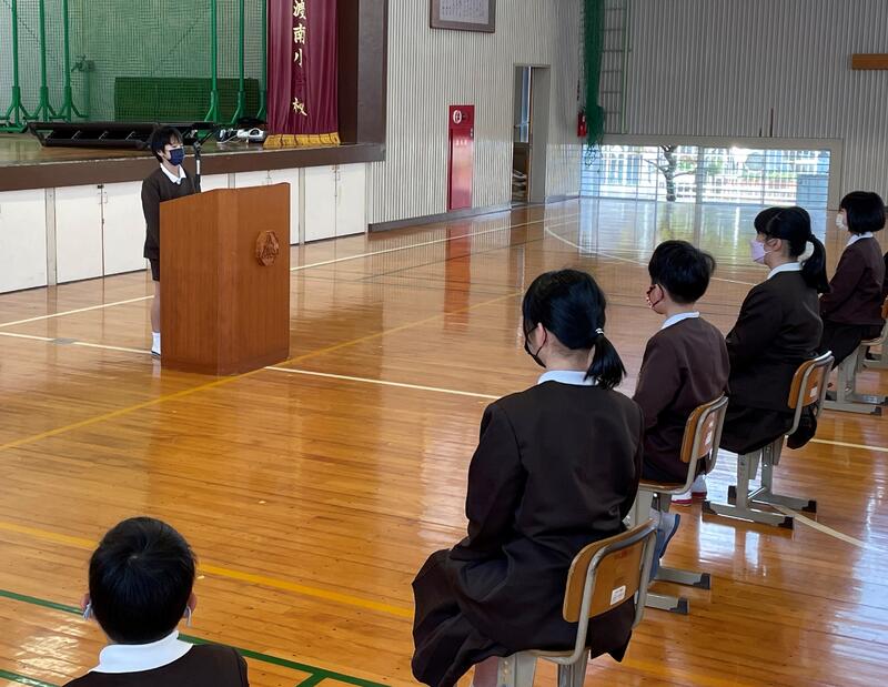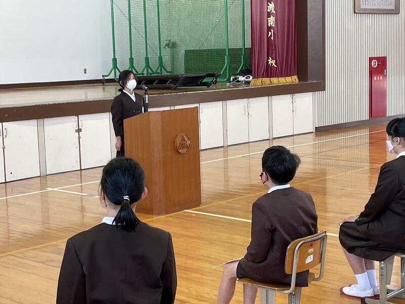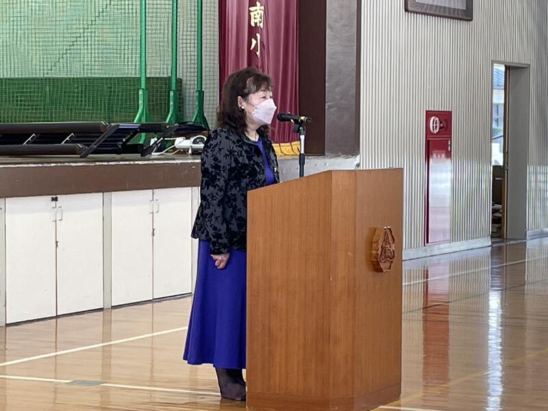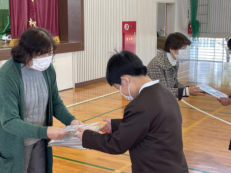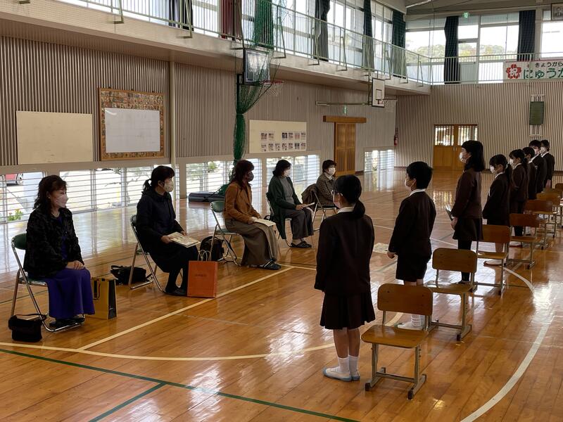 3月9日(水)、本渡町更生保護女性会5人の皆さんに、今年度で10歳になった4年生に「つなし」の節目としてお祝いの会をしていただきました。体育館で新型コロナウイルス感染防止の対策をしっかり取りながら行いました。