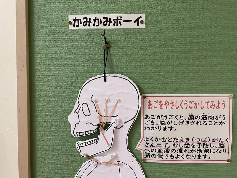 動く掲示物で、子供たちは津々津々です。動かしながら顎の働きを知ることができます。