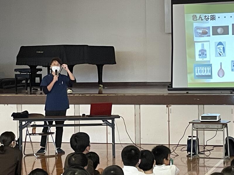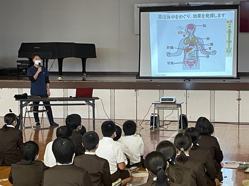 まずは薬物について、違法薬物だけではなく、子供たちの身近にあるお酒やタバコも薬物であることや、薬の効き方や薬物乱用とはどういうことかをスライドを使って分かりやすく教えていただきました。