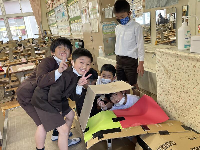 先週木曜日、図画工作の「ダンボールに入ってみると」の学習をしました。大きなダンボールを切ったり、つなぎ合わせたりして、思い思いの作品を作っていました。