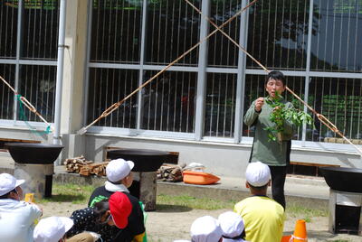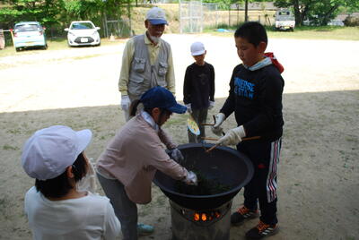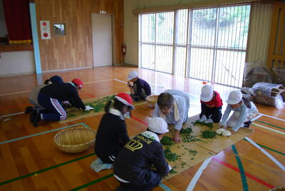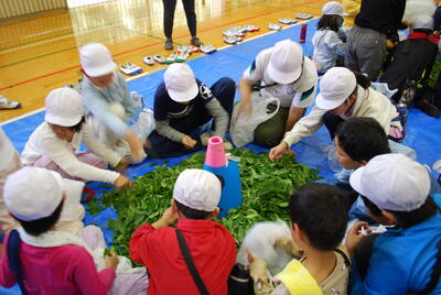 今年度も全校児童で、茶摘みの体験をすることができました。4年生が、お茶の葉っぱの摘み方を説明の後、名人の廣田さんから今年のお茶についてお話を聞きました。そして、楽しみにしていたお茶摘み。縦割り班に分かれて、若葉を摘んでいきました。頑張って摘んだお茶の葉は、午後から、3年生と4年生が、煎って揉んでを繰り返しながら製茶に仕上げていきました。地域の方に、もみ方や煎り方を教えていただき汗をかきながら頑張りました。体育館は、お茶の香りいっぱいになりました。全校児童が摘んだ茶の葉を全部製茶にして、3年生4年生は大満足。最後に、お茶を試飲。とってもおいしいお茶ができて、またまた大満足でした。