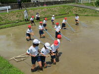 5年生の米づくりは、「代おし」の体験をさせていただきました。米づくり名人さんに道具の使い方を教えていただきながら、柄振等を使って田んぼの土を平にしました。