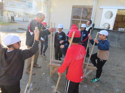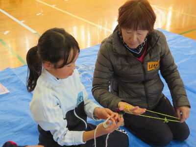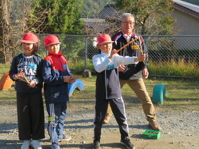 12月18日(木)に3年生が地域の名人さんに昔のあそびを教えていただきながら、体験しました。まずは、体育館で竹とんぼや羽子板、あやとり、おはじきあそび、お手玉、けん玉、ぶんぶんごまなどを体験しました。ALTのカタリーナ先生も初めての体験で興味津々、とても楽しんでおられました。次に、外に出て駒まわしや水鉄砲、ゴムでっぽう、竹馬、缶ぽっくりなどを体験しました。たくさんの遊びを体験して、大満足の3年生でした。