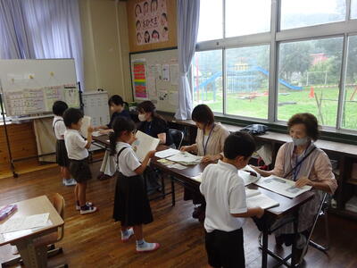 音読を聞いていただいたり、丸付けをしていただいたりしている1年生。たくさん褒めてもらい、笑顔いっぱいでした。
