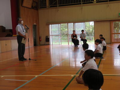 お二人の先生のことを児童に紹介する校長先生。
