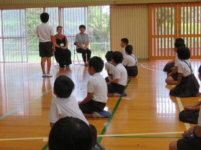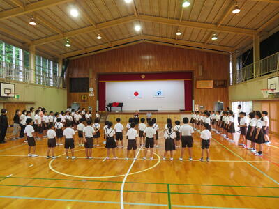 9月1日(金)に新しく着任されたALTの先生と、今年度6月から着任されている地域学校協働活動推進員の先生お二人を歓迎する式を開催しました。