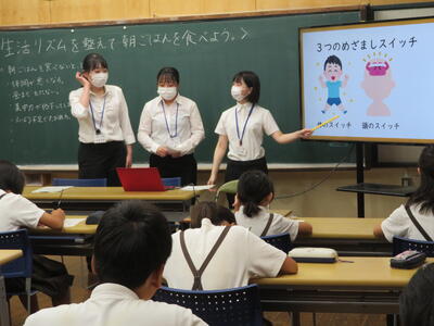 朝食を食べると3つのスイッチが入ることを説明する講師の先生。子供たちは、朝ご飯により「体のスイッチ」「頭のスイッチ」「おなかのスイッチ」が入ることを知り、朝食をとることの重要性に気付きました。