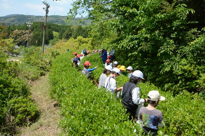 全校児童と職員、保護者の方、そして、コミュニティースクールに関わってくださる地域の方々も参加していただき、丁寧に茶葉を摘みました。