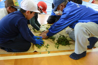 上の写真は、地域の方に教わりながら、丁寧に茶葉を揉んでいる様子です。