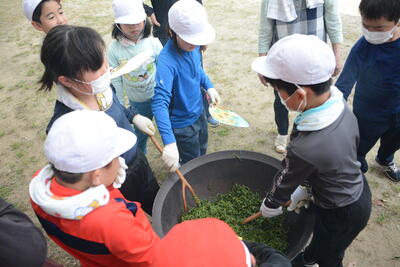 右の写真は、揉んだ茶葉を煎って、水分を蒸発させている様子です。熱い中、掻き混ぜながらの作業は大変ですが、子ども達は、意欲的に作業を続けました。