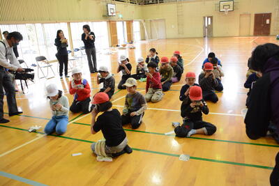 <凧の作り方について、指導者の先生の話を聞く子ども達>