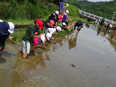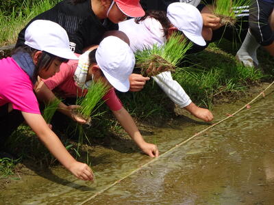 地域の支援員の方が熱心に指導してくださり、児童は一束一束、丁寧に苗を植えました。秋には稲刈りをする予定です。心のこもったおいしいお米をいただく日が。大変楽しみです。