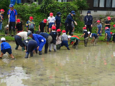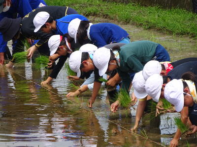 6月9日(金)に地域の土地をお借りして、全校児童、職員、保護者で田植えを体験しました。
