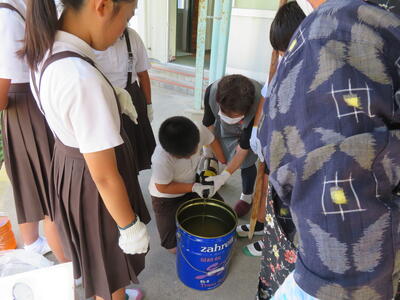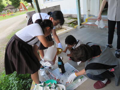 ボランティアの先生に教えていただきながら、材料になる廃油の量を測っているところです。