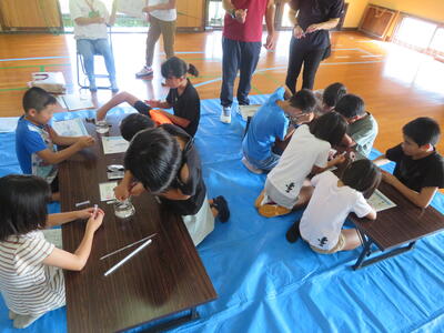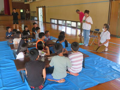 午前中は、開校式の後、川の水質検査、天草土人形絵付け体験がありました。おいしい昼食を食べてから、午後に様々なニュースポーツを体験しました。最後に感想文を書いて活動を振り返り、閉校式をして解散しました。