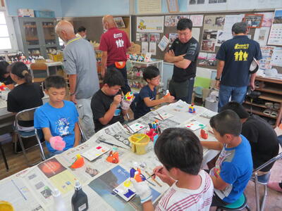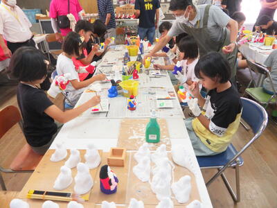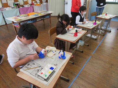 講師の先生のご指導で、児童は絵付けの仕方を学び、自分が選んだ土人形の絵付けを丁寧に行いました。一人一人が色合いを考えながら集中して取り組み、色鮮やかな土人形が完成しました。7人とも大変満足そうでした。