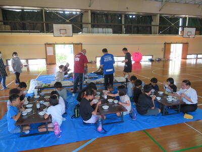 おこわや混ぜご飯のおにぎり、ソーメン等おいしい昼食をいただく子供たち
