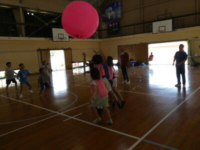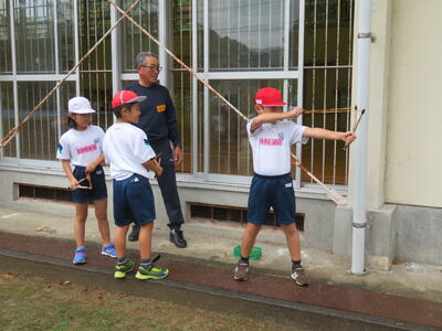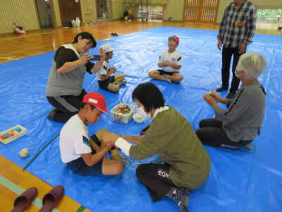 地域の「昔遊び」の先生を10名お迎えし、体育館外では、「ゴム銃」「水鉄砲」「突き鉄砲」を楽しみました。