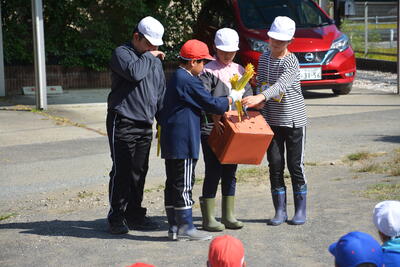 苗の植え方を具体物を活用して説明する5年生。種まきから苗作りまで、5年生が一生懸命取り組み、立派な苗に育てました。