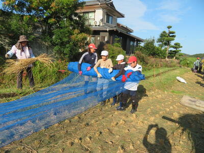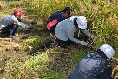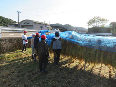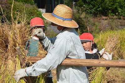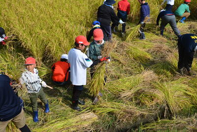 6月9日(金)の田植えから約4ヶ月、地域の指導員の方々の大きな支えにより、立派に育った稲を全校児童、指導員の方、保護者・地域の方、学校職員で協力し合い、丁寧に刈り取りました。そして、稲を乾燥させるために、組み立てた竹にかけ干しをしました。