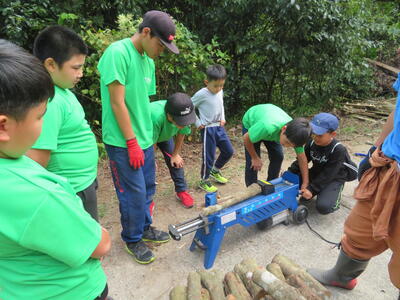 <薪割り用機械を使って、燃焼用の薪をつくる子どもたち>