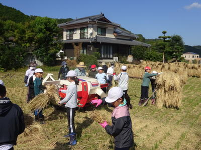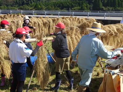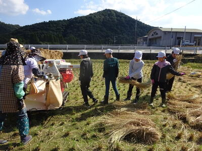 10月17日(火)に5年生が脱穀をしました。天候に恵まれ、稲刈りから11日目という早さでした。2組の地域の指導員ご夫婦に助けていただきながら、子ど<もたちは干してあった稲を丁寧に運び、脱穀機へ持って行く作業を繰り返し行い、およそ1時間で終えることができました。