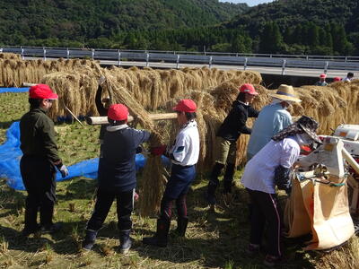 <みんなで協力し合い、脱穀がどんどん進んでいきます>