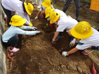 <1年生が芋の周りの土を丁寧にとり、芋を掘り出そうとしています>